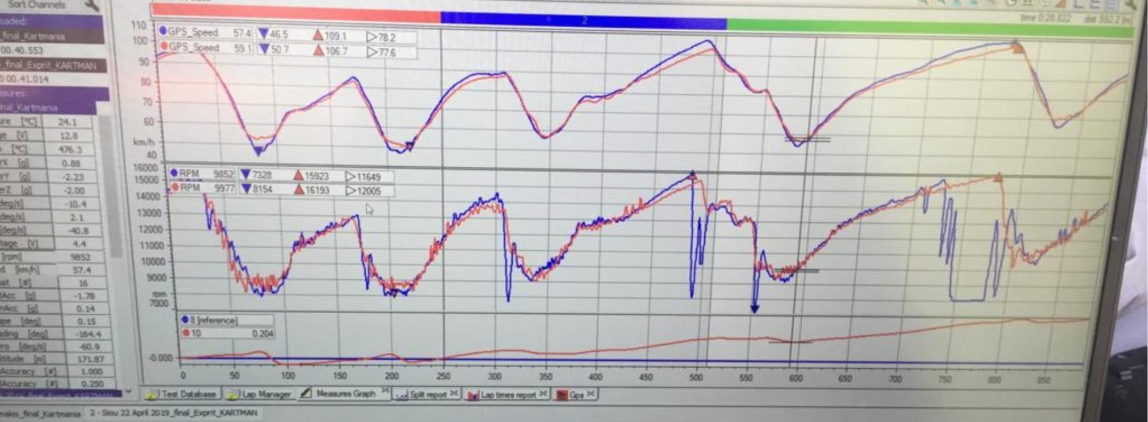 I am the red line, and he is the blue line. My best lap is 41 seconds, and his is 40.55 — a huge difference in our sport.